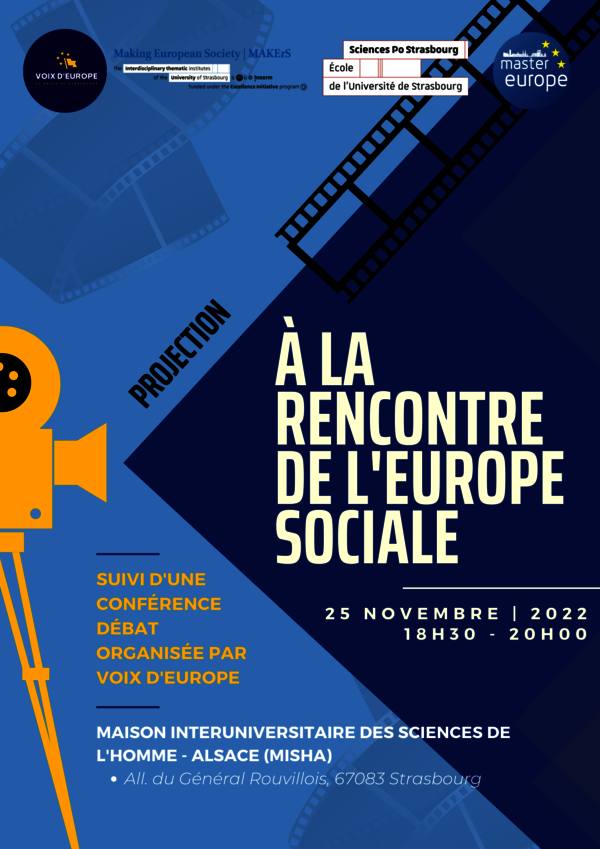 La projection du film documentaire Eurodoc aura lieu vendredi 25 novembre 2022 à 18h30 à la MISHA. Eurodoc est un projet pédagogique de film documentaire sur l’Europe sociale porté par Sciences Po Strasbourg, dans le cadre de son Master Études Européennes et Internationales (EEI), et par le Centre…