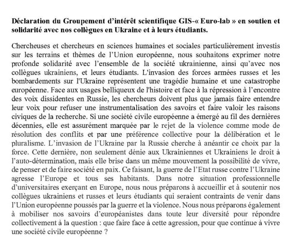 Déclaration du GIS Euro-Lab en soutien et solidarité avec nos collègues et leurs étudiants en Ukraine