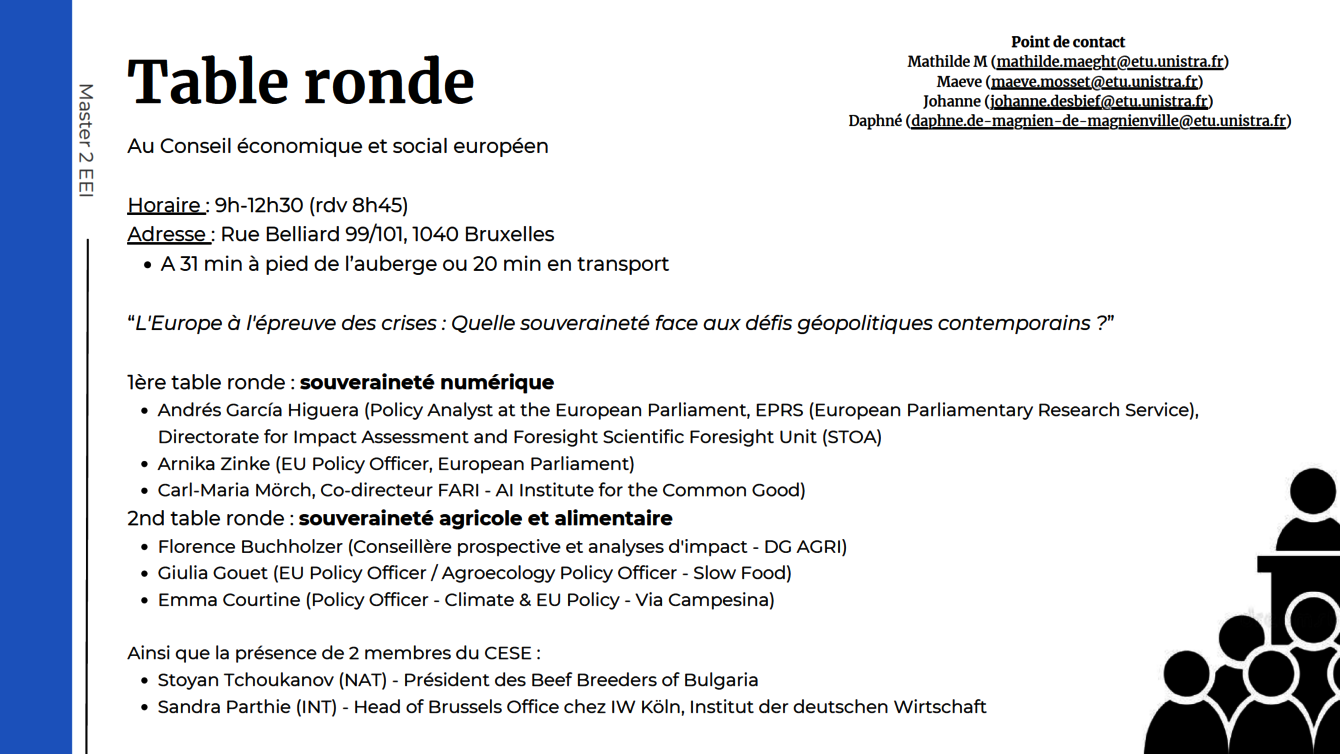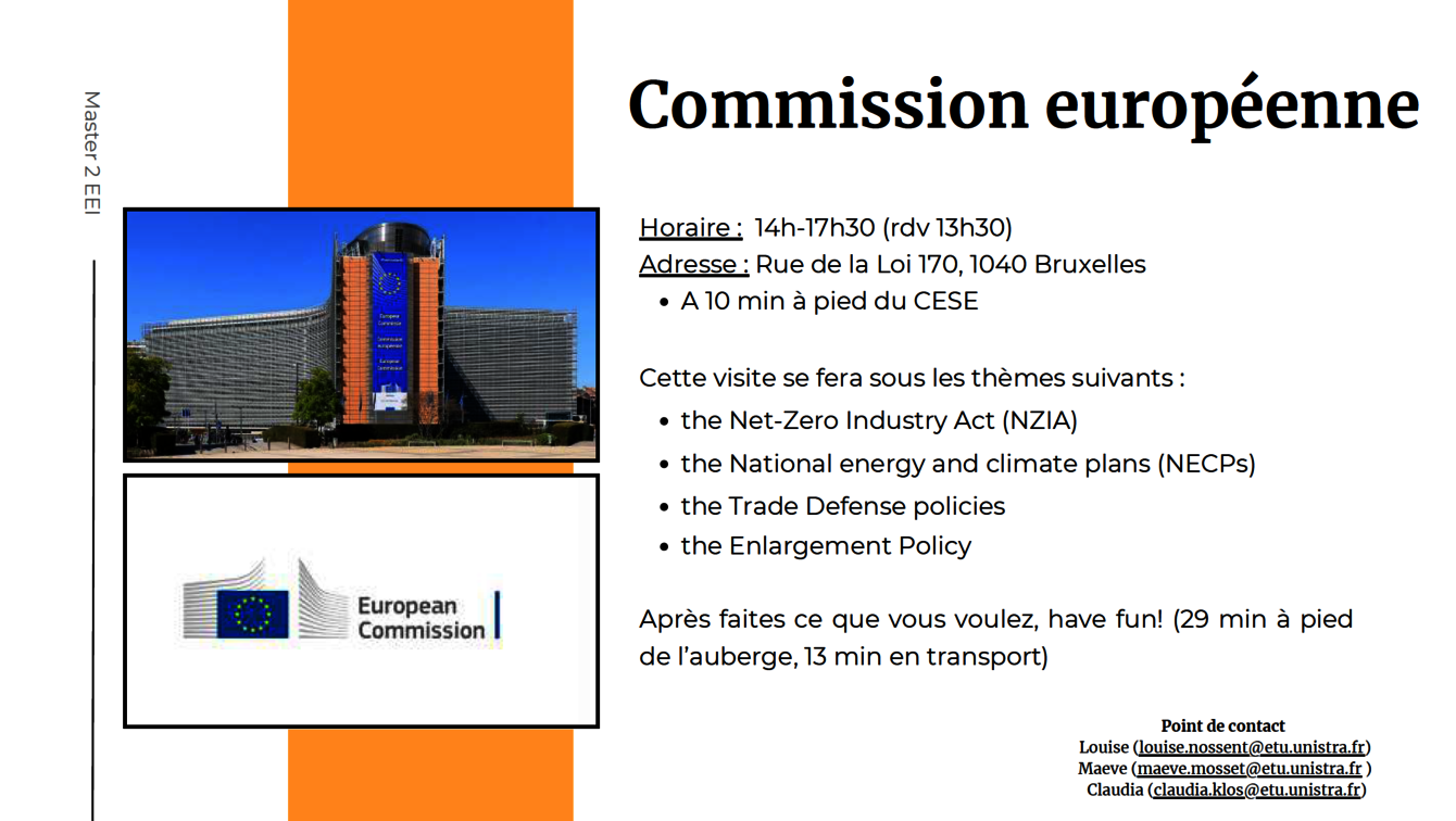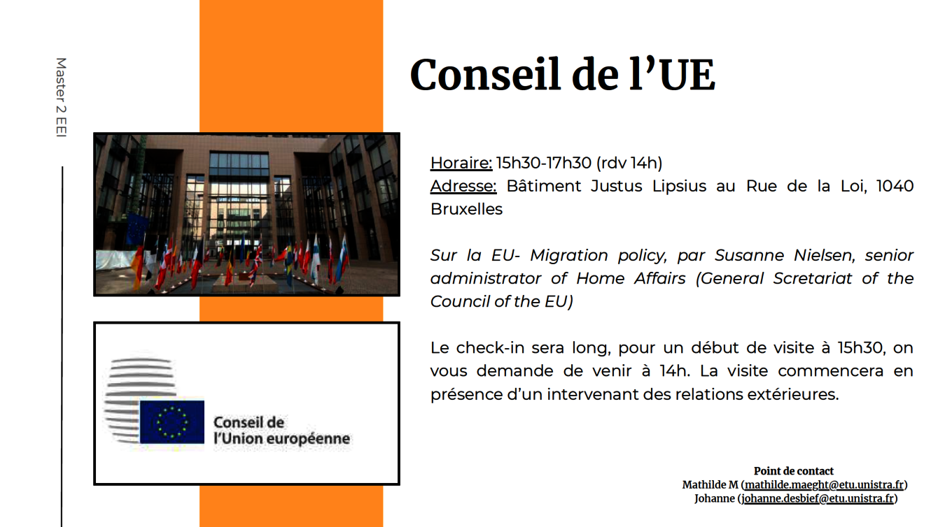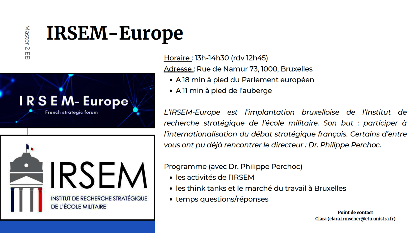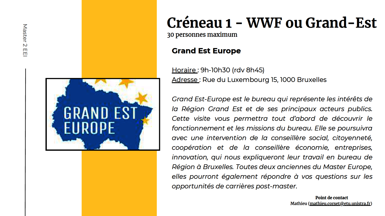 Les visites institutionnelles (Commission Européenne, Conseil de l’UE, Parlement Européen, OTAN, Comité européen des régions, RP France, Bureau Grand Est Europe, IRSEM…), basées sur des interventions de haut niveau et en phase avec l’actualité européenne (the EU Digital Sovereignty, the Agriculture and Food Sovereignty, the Net-Zero Industry Act, the EU Migration Policy…) ont été complétées par des rencontres avec des acteurs non-étatiques des politiques européennes (Accenture Labs, Lobby européen des femmes, WWF…) pour couvrir la diversité des métiers de l’Europe et des intérêts des étudiant.es.