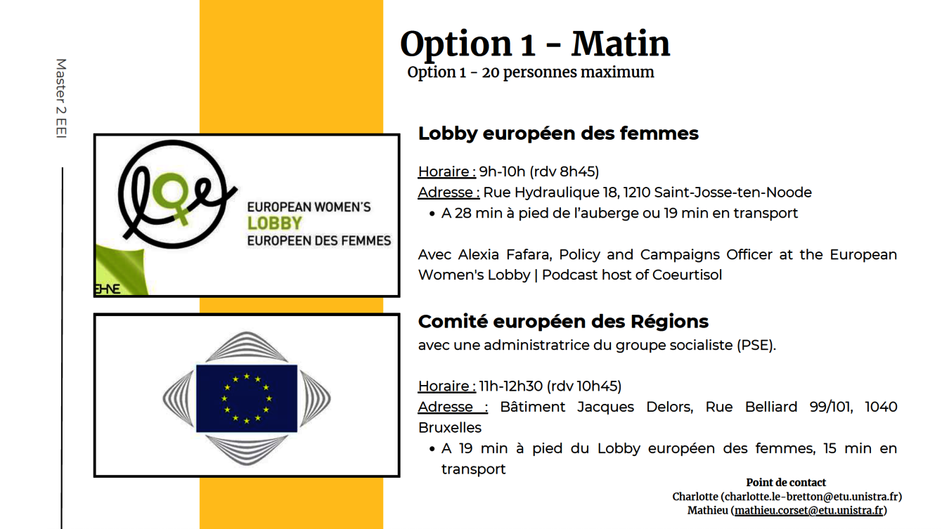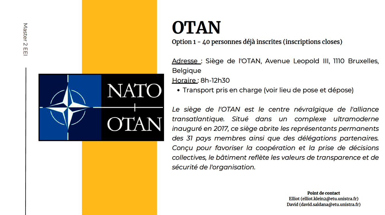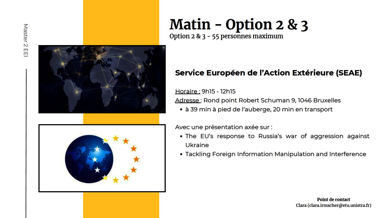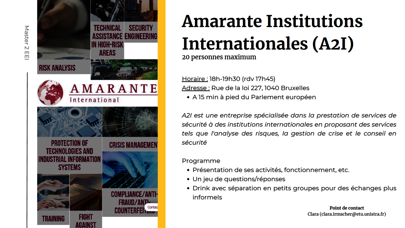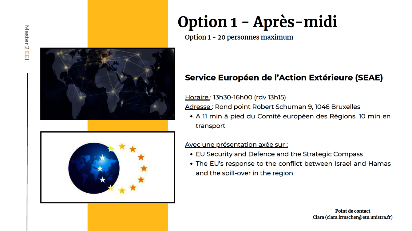 Les visites institutionnelles (Commission Européenne, Conseil de l’UE, Parlement Européen, OTAN, Comité européen des régions, RP France, Bureau Grand Est Europe, IRSEM…), basées sur des interventions de haut niveau et en phase avec l’actualité européenne (the EU Digital Sovereignty, the Agriculture and Food Sovereignty, the Net-Zero Industry Act, the EU Migration Policy…) ont été complétées par des rencontres avec des acteurs non-étatiques des politiques européennes (Accenture Labs, Lobby européen des femmes, WWF…) pour couvrir la diversité des métiers de l’Europe et des intérêts des étudiant.es.