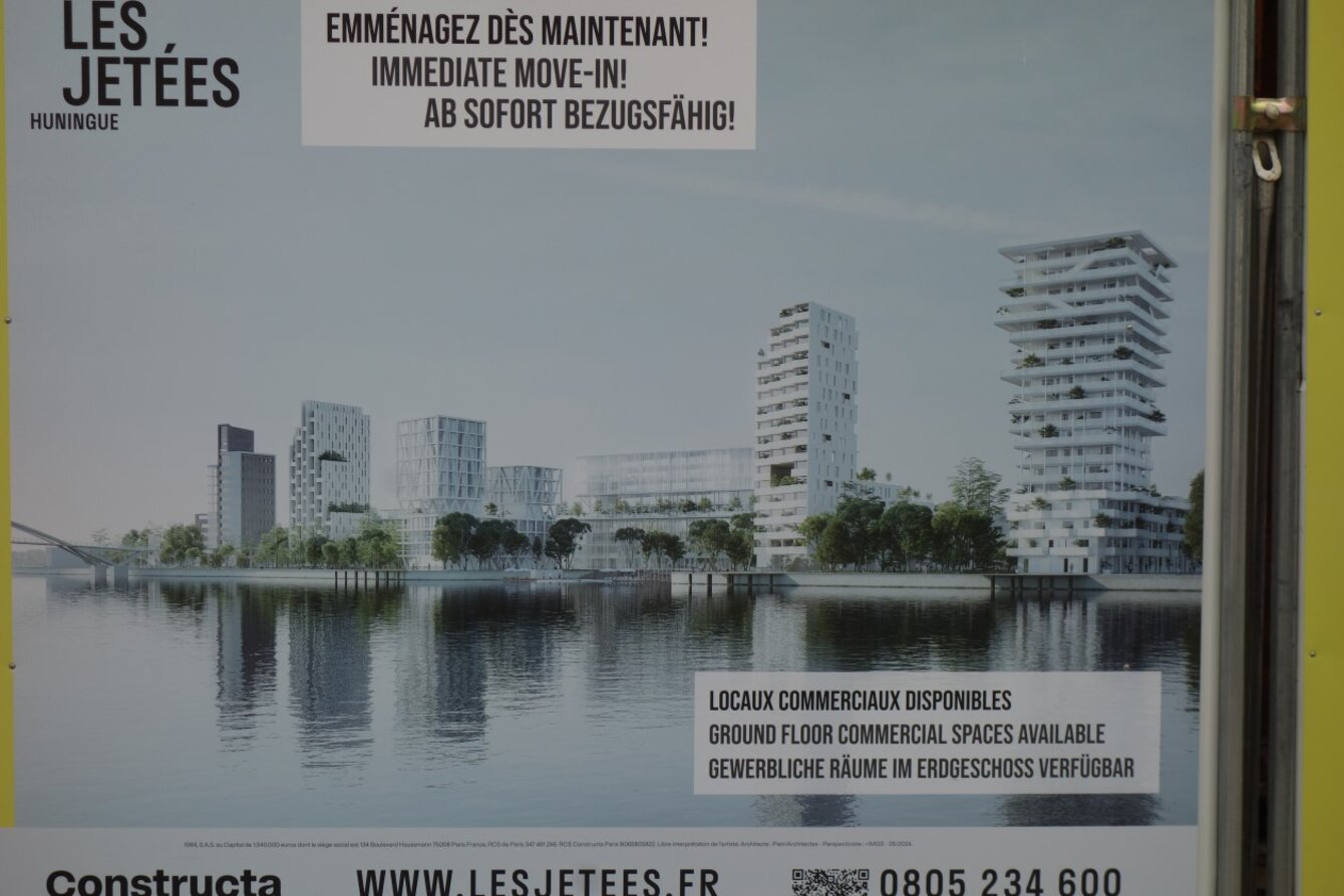 - La première partie de la visite a été consacrée au projet de coopération transfrontalière « Dreiland » impliquant les villes de Bâle, Weil-am-Rhein et Huningue. Judith Lenhart, cheffe de projet à l’EuroDistrict de Bâle, a assuré la visite et la présentation des principaux projets en cours. L’enjeu essentiel consiste à imaginer et réaliser la reconversion partielle de ce secteur de près de 600 ha, encore fortement marqué par les activités industrielles et portuaires, vers un quartier résidentiel et d’activités tertiaires (il est prévu d’y accueillir 20 000 personnes à terme), dans le cadre d’une programmation transfrontalière. La réalisation la plus concrète à ce jour est l’aménagement « Vis-à-vis », un parc transfrontalier entre Weil-am-Rhein et Huningue. En projet, un nouveau pont sur le Rhin mobilise visiblement beaucoup de moyens et d’énergie. Cette partie de la visite a mis en avant le côté institutionnel de la coopération, dans le cadre d’un grand projet qui semble assez marqué par la dynamique prépondérante de Bâle, et qui semble s’inscrire dans des concrétisations plutôt classiques portées par des grands acteurs économiques comme en témoignent les réalisations immobilières en front de fleuve à Huningue (voir photo).