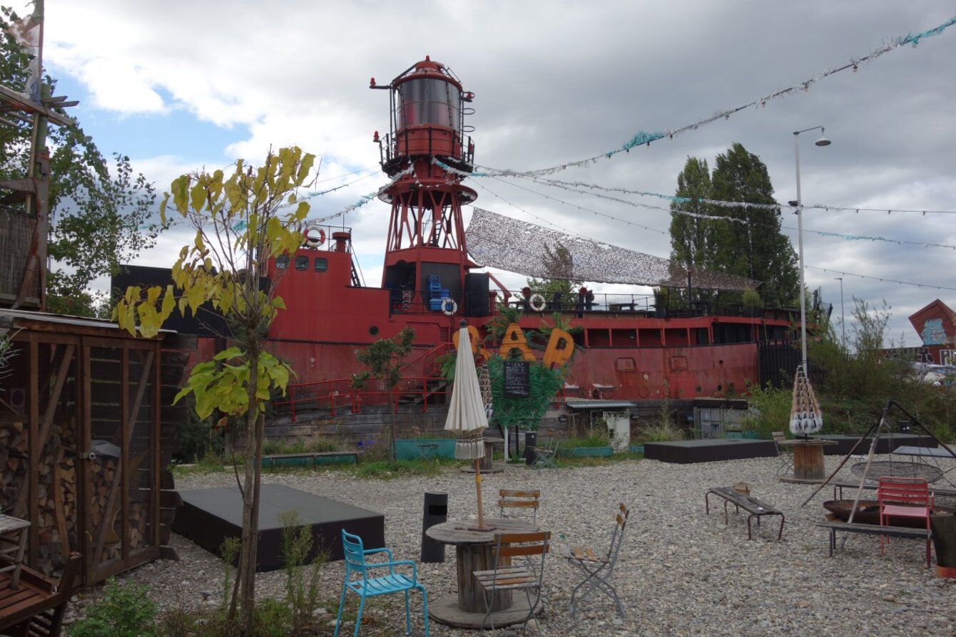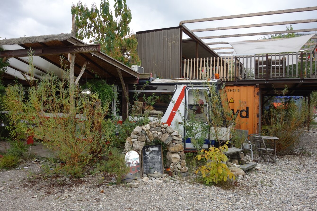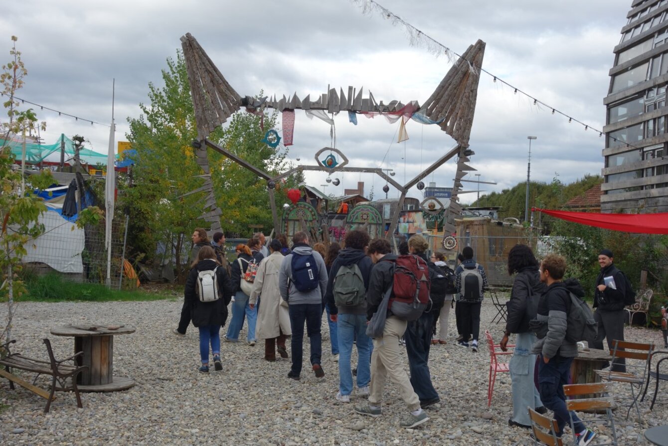 - En contraste avec cette première approche, la visite de l’après-midi a permis aux étudiants de découvrir les réalisations d’urbanisme transitoire le long de la Uferstrasse à Bâle. Willi Moch, de l’association I_Land et Tom Brunner de l’association ShiftMode ont assuré la visite. Le canton de Bâle, propriétaire d’un terrain d’environ 2,5 ha, autrefois occupé par des dépôts de carburant (Esso et Migrol), a, en 2014 et en attendant un aménagement futur, loué ce terrain aux deux associations en tant qu’organisatrices générales du secteur pour une durée initialement prévue de 5 ans (prolongée depuis jusqu’en 2029). Une trentaine de constructions et d’activités se sont installées sur le terrain, essentiellement dans le domaine de la nourriture et de la culture. Les constructions ont pratiquement toutes été réalisées avec des matériaux de récupération ce qui confère à l’ensemble un aspect très varié et original qui contraste fortement avec l’urbanisme très ordonné de Bâle. A noter que la première occupation du terrain après le déménagement des installations portuaires s’est traduite par l’installation de roulottes, non autorisées mais temporairement tolérées. Les installations actuelles, davantage régulées par les associations porteuses, ont été voulues par le canton pour contenir l’occupation « sauvage » (qui reste tolérée sur une partie réduite du terrain), ce qui n’a pas manqué de générer des conflits entre les premiers occupants et les nouvelles associations perçues comme le bras armé du Canton. Entre temps, les interactions semblent d’être apaisées et deux activités sur ExEsso sont portées par des occupants des roulottes. De même, les associations cherchent à « normaliser » les liens avec les habitants riverains, plutôt méfiants au départ, en tentant d’attirer un public le plus large possible aux manifestations afin d’éviter un entre soi trop marqué par la scène alternative.