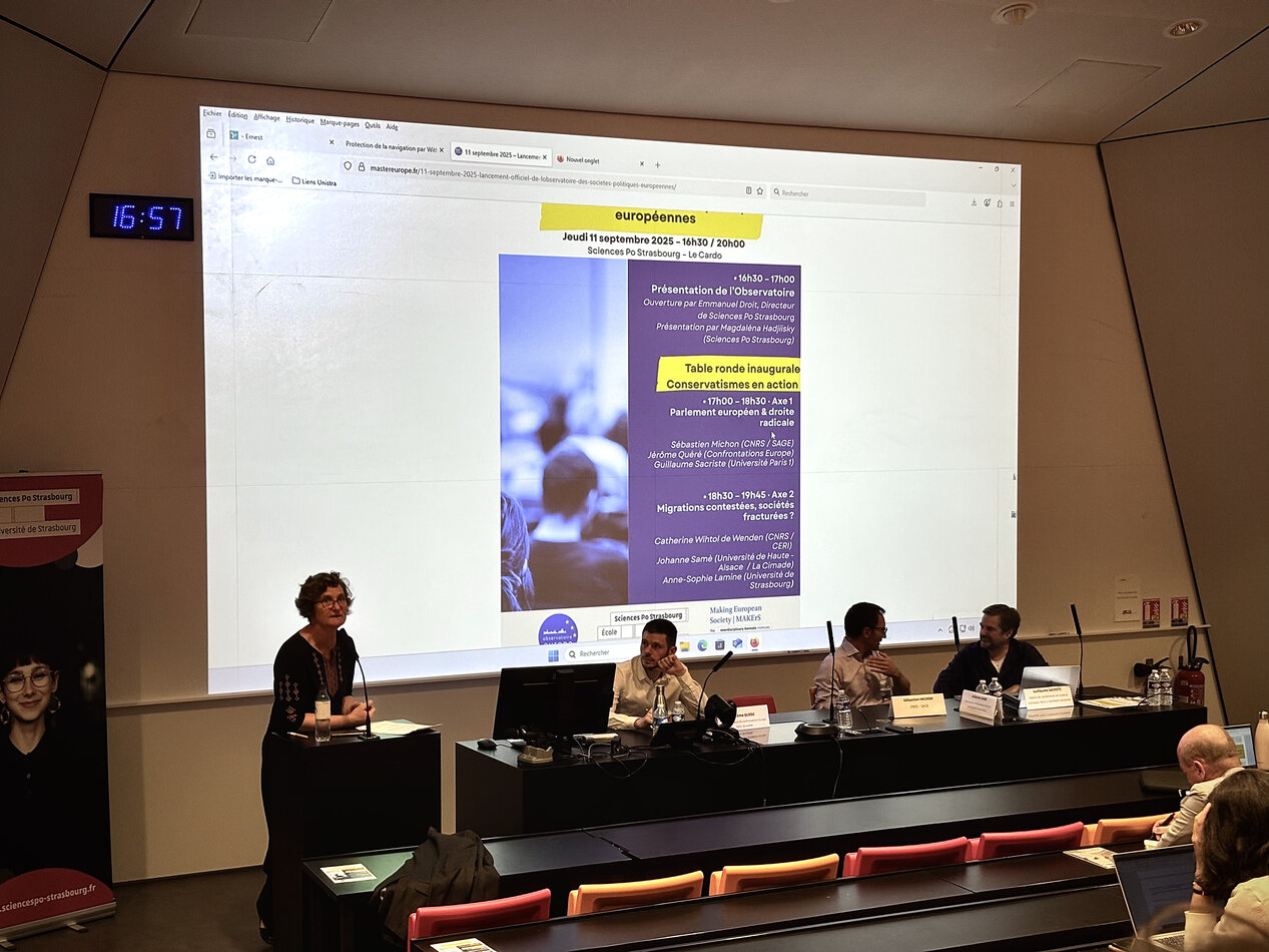Le Master Études européennes et internationales (EEI) de Sciences Po Strasbourg en collaboration avec le think tank « Confrontations Europe » et le soutien de l’ITI MAKErS ont organisé le jeudi 11 septembre 2025 le lancement officiel de l’Observatoire des sociétés politiques européennes dans les locaux de Sciences Po Strasbourg.