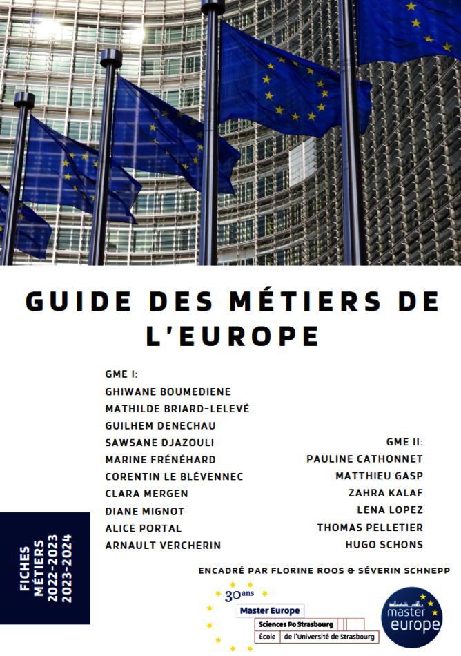 Le Guide des métiers de l’Europe vise à aider les futurs diplômé.e.s à s’orienter dans le monde professionnel, que ce soit à Bruxelles, au niveau national ou local. Fruit d’un travail collaboratif réalisé par deux groupes de travail du Master Europe de Sciences Po Strasbourgentre 2022 et 2024, le Guide contient 32 « fiches métiers » recouvrant un ensemble représentatif des métiers auxquels sont destiné.es les étudiant.es du Master et tout.e autre étudiant.e intéressé.e.