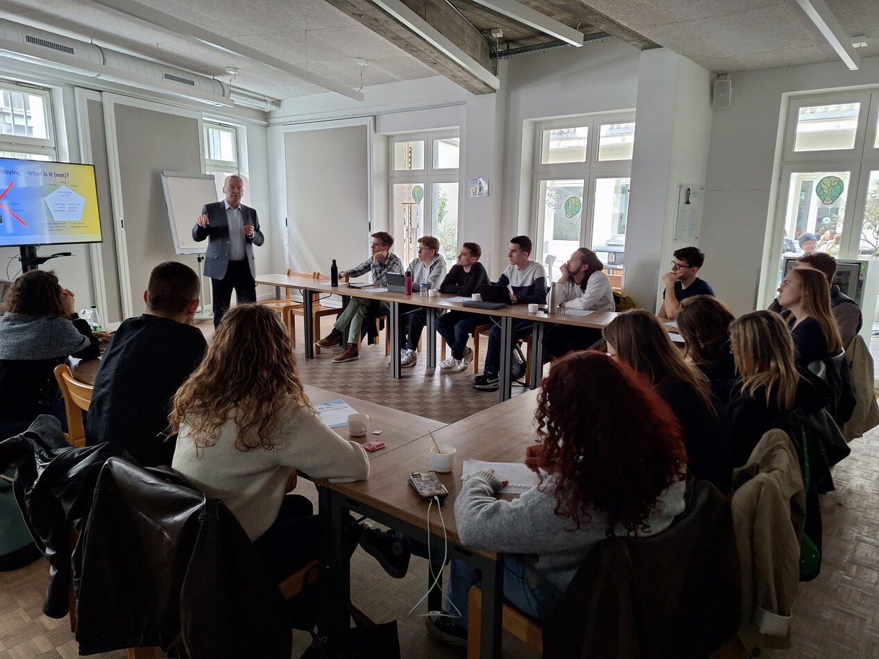 Deux conférences ont été organisées à l’auberge de jeunesse lors du premier jour du voyage : la première avec M. René Laurent Ballaguy de la Banque Européenne d’Investissement (BEI) et la deuxième avec M. Frédéric Baab, Procureur européen français au Bureau du procureur général européen (BPGE).