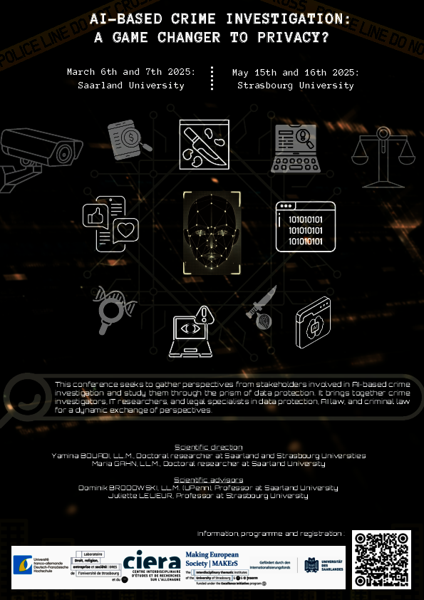 Organisé entre mars et mai 2025 par Yamina Bouadi (Université de Strasbourg et de la Sarre) et Maria Gahn (Université de la Sarre), avec le soutien scientifique de Dominik Brodowski et Juliette Lelieur, le double colloque international “AI-based Crime Investigation: A Game-Changer to Privacy?” a réuni chercheurs, juristes, informaticiens et praticiens pour interroger les tensions entre intelligence artificielle et vie privée dans les enquêtes pénales.